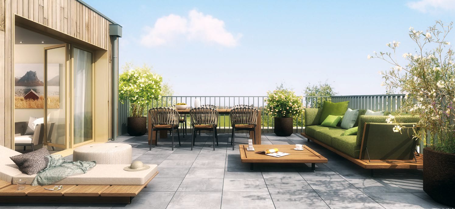 Appartement type 3 pièces (2 chambres), pièce de vie 31 m2 et terrasse 17m2.